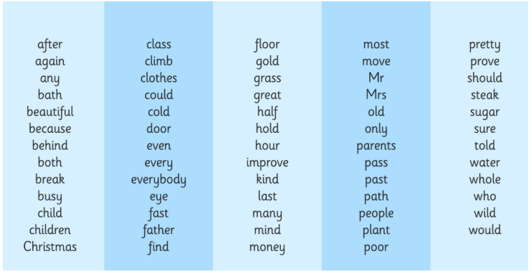 These are the Common Exception Words (CEWs) that children are expected to be able to read and spell by the end of Year 1. A Common Exception Word is a word which does not follow the common phonetic spelling rules of the language, or where the usual rules act in an unusual way.